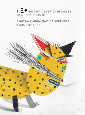 Leo era pequeno, e adorava ver os detalhes do mundo gigante: sua casa, seu bairro, os adultos. Mais do que observar, gostava de aprender o nome de tudo e inventar palavras. Mas discordava de muita coisa: Por que jabuticaba é tão pequena e tem um nome tão grande e jaca é tão grande e tem um nome tão pequeno? Até que percebeu que de palavras pequenas vinham grandes coisas. Reparou no mar. No céu. E no não. Até que um dia Leo cresce e vira Leonardo. Leo é filho da D. Conceição e do Sr. Cláudio, sobrinho da Palmira e do Jonas, neto da D. Esmeralda e do Sr. Juvenal. Mas o curioso é que, mesmo depois de grande, Leo ainda se encontra com Bel, Edu, Fred, Duda.